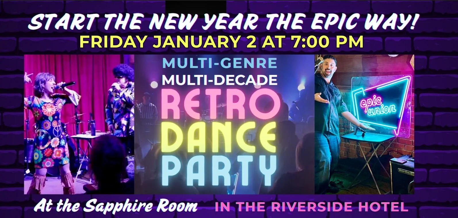What's your retro? From the disco of the '70s to the pop hits of the 2000s, EpicUnion has you covered! Join Boise’s ultra fun dance-party cover band at the Sapphire Room for a night of retro dance hits from the '70s, '80s, '90s, and beyond. Dress up in your best decade-inspired looks or as your favorite music star (optional) and come enjoy the EPIC retro dance party!